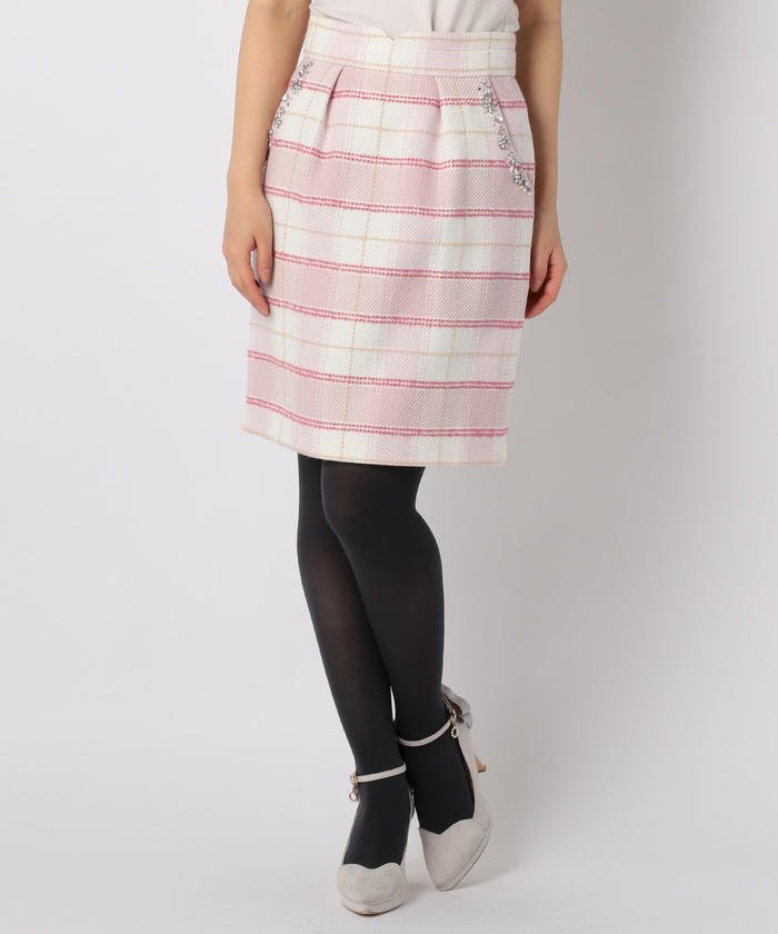 カジュアル柄の定番、チェック柄を使ったスカートです。大人っぽく着られるタイトなシルエットで、甘くなりすぎずに着られます。ポケット部分にはビジューをあしらい、トップスINスタイルのおしゃれに差が付くアイテムです。