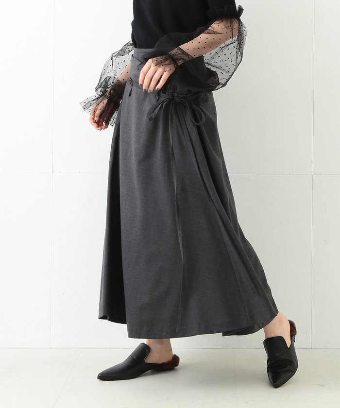 スカートを重ね履きしたようなデザインのロング丈スカート。マニッシュなスーツ生地を使用し、適度なハリ感がシャープな印象を与えます。外側スカートの左脇はゴムでギャザーを寄せ、紐でアクセントをつけるデザインがポイント。アシンメトリーなシルエットが絶妙で、着用するだけでおしゃれオーラを放つ魅力的なひと品です。ニットやシャツなど様々なアイテムとの相性抜群です。