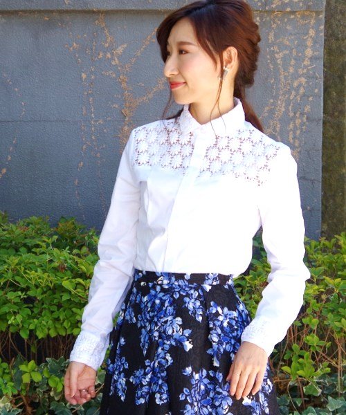 丸襟デザインのエレガントな長袖シャツです。襟とカフス、フロントヨークにレースを使用し、リュクスに薫る1枚に仕上げています。フロントヨークのレースは透け感をだし、女性らしさを演出しました。素材は軽やかさがあり、適度なストレッチ性で動きやすさも抜群。フライフロントを用いてすっきりとさせており、ドレスシャツとしてもお召しいただけます。