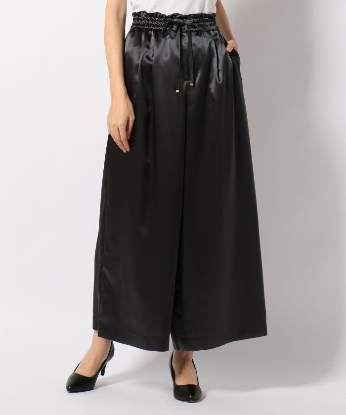 上品な光沢感のあるサテン地で仕立てた、洗練ムード漂うワイドパンツ。◆デザイン◆素材に光沢感があるため、かしこまった印象になりすぎないようにしています。ストンとしたワイドシルエットで、レッグラインを拾わない豊かなシルエットがスタイルよく見せてくれる、ラインにこだわったのが特徴です。ウエストはゴム仕様なのでフィット感もよく、着心地抜群です。カジュアルから綺麗めまで幅広いスタイリングに活躍してくれるアイテムです。◆素材◆トレンドに挙げられている燻した金属のような、光沢を出した素材。通常のサテンとは異なりクレープ糸(強撚タイプ)を使うことでナチュラルな表面感をだしている。温かみのある冬素材との相性が良い素材感。