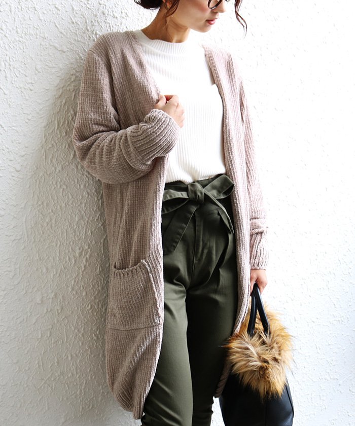 カーディガン ニット レディース ベロアモール ロング丈 ローゲージ トップス