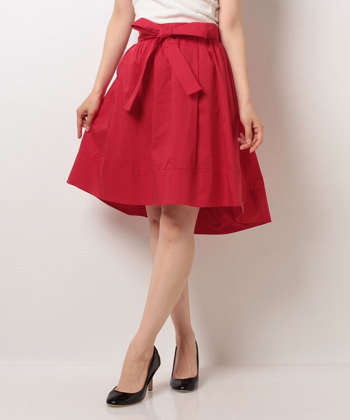 バックを長めに設定したフィッシュテールヘムが、着こなしに奥行きを生み出すギャザースカート。ぱりっとしたハリのあるマテリアルが理想的なフレアシルエットをメイク。きゅっと結ばれたリボンが可愛くアピールするアイテム。