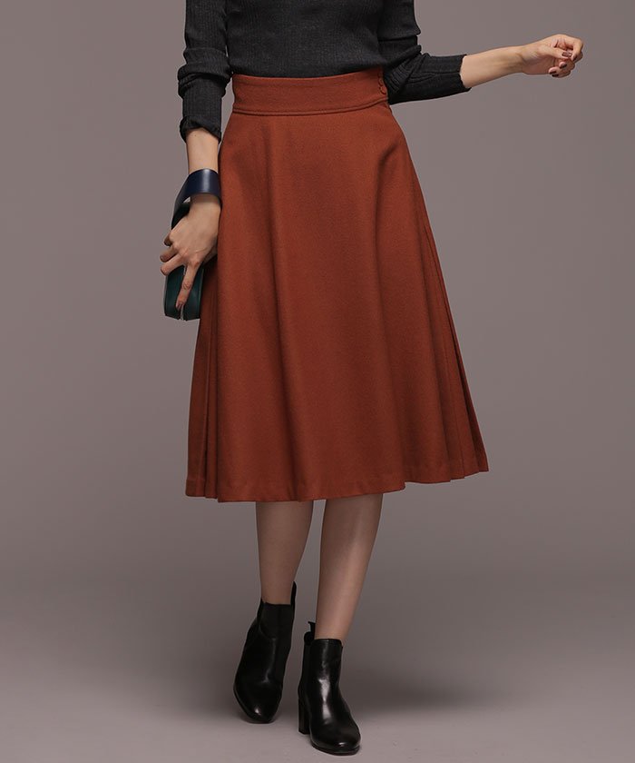 サイドタックでエレガントなフレアー感が演出するスカート。膝が隠れる上品なミディ丈が好印象。ウエスト背面のゴム仕様が履きやすく、ギャザーデザインが女性らしいポイントに。裏地付きなので足通りが滑らかで安心できる履き心地です。しっかりとしたウール混の生地で仕立てた膝まで暖かい一着。どんなトップスを合わせてもレディライクに決まるフェミニンなアイテムです。無地の3色に加え、チェック柄もご用意しています。