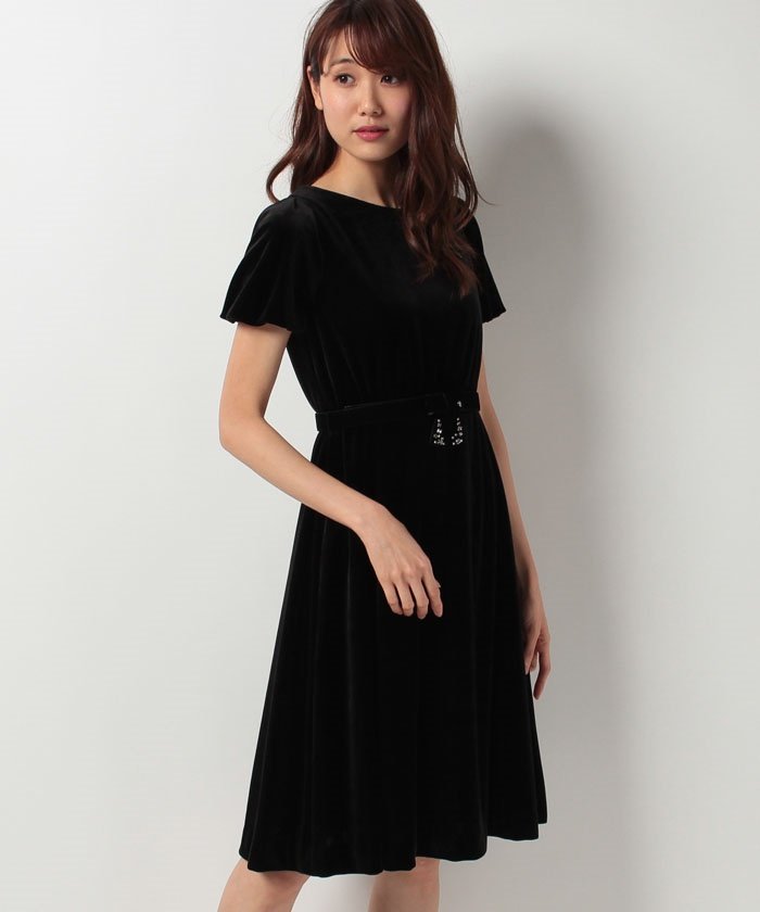 美しいシルエットが自慢のベロアワンピース。トレンド素材を取り入れて、今季らしい1着に仕上げました。ビジューを散りばめたベルトをセットして、スタイルアップに欠かせないウエストマークもバッチリ。