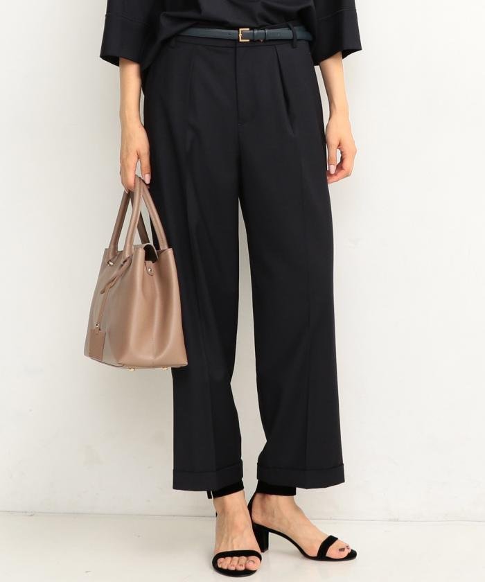 2017AW女性らしいしなやかな素材感と、メンズライクなシルエットでスタイリッシュに着こなせるワイドストレートボトム。【素材】ウールとマイクロポリエステルをブレンドすることでウール本来の風合いを損ねることなく、ポリエステルの上品な微光沢感、ドレープ性に優れた、女性らしくしなやかでソフトな素材に仕上がっています。【デザイン】クロップド丈のセンタープレス、マッキン裾のワイドストレートのシルエットは、股上深めで腰回りが少しゆったりしているのでメンズライクに着こなしていただけるアイテム。ウエストにはタックを入れているので立体感のあるシルエット。同素材のセットアップブラウスはもちろんのこと、女性らしいクリーンなシャツと合わせたり、すっきりとしたニットとも着合わせやすい万能ボトムです。▼同素材セットアップ▼コンフォートウールプレミアム ブラウス(BLWOHA0306)